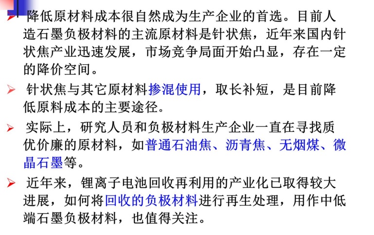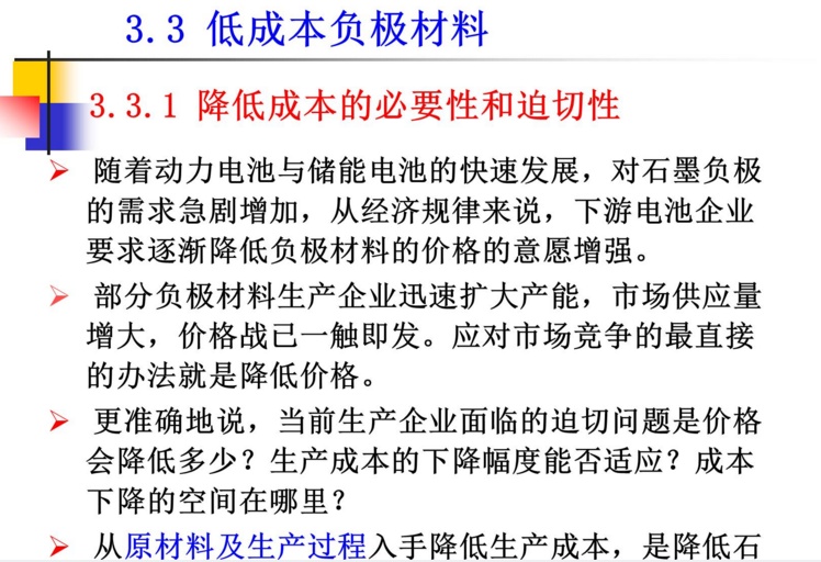 天然石墨負(fù)極材料生產(chǎn)成本低,但改善倍率性能和循環(huán)性能的難度較大;從技術(shù)的角度進(jìn)一步降低人造石墨負(fù)極材料生產(chǎn)成本的空間較小,劉教授在講課過程中說到,人造石墨負(fù)極材料大多是用軟碳制備。