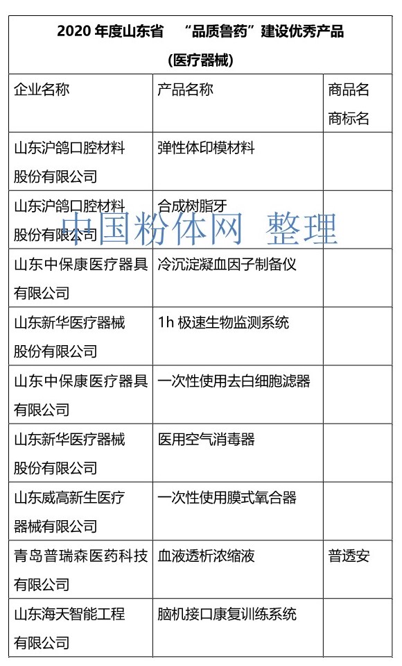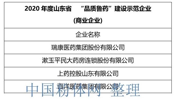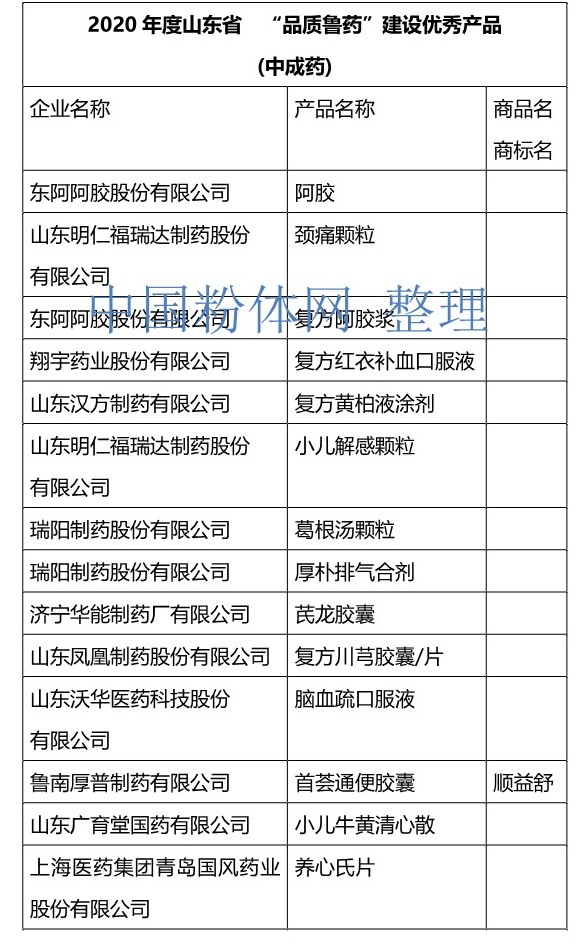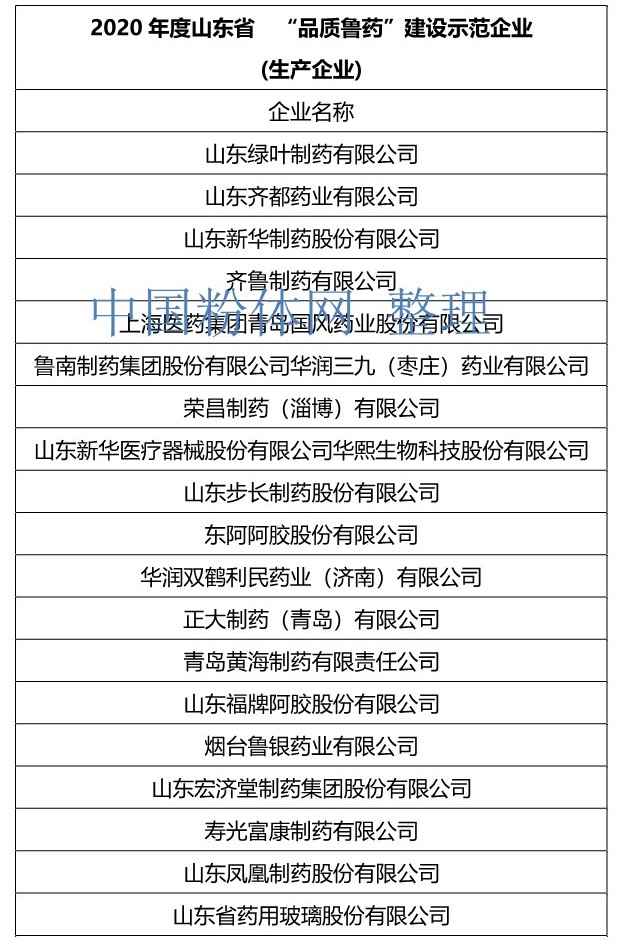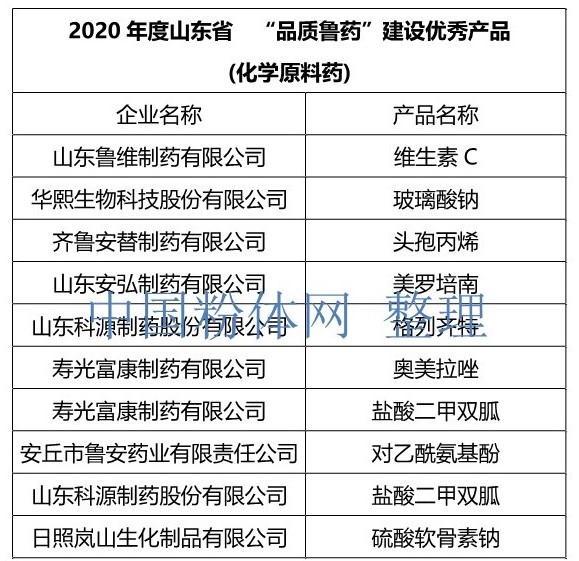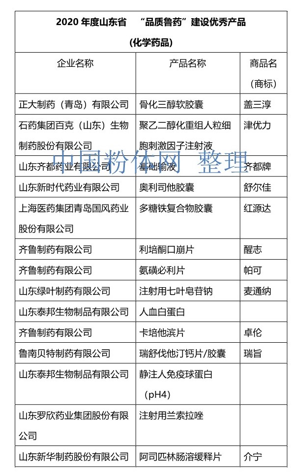 中國粉體網訊 近日,山東省醫藥行業協會組織開展2020年度山東省“品質魯藥”品牌建設發布活動,會上發布2020年度山東省“品質魯藥”品牌建設示范企業36個和優秀產品106個,并現場進行頒獎儀式。