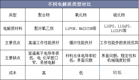 固態電池相較于傳統鋰電池,有著更為優異的性能,固態鋰電池的安全性極高,無自燃、爆炸風險;能量密度高,有望解決傳統鋰電池的續航里程問題;可實現快充。目前固態鋰電池的電解質有三種:聚合物電解質、硫化物電解質和氧化物電解質,有的已經在小規模使用或接近商業化,有的還在完善過程中。