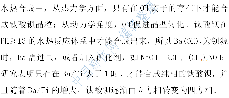 鈦酸鋇電子陶瓷所用鈦酸鋇粉體一般為四方相,要想直接水熱合成出四方相鈦酸鋇,就需要使用高活性的前驅(qū)體,或者通過(guò)提高反應(yīng)體系的Ba/Ti、堿度,添加輔助劑,如表面活性劑,與其他技術(shù)相結(jié)合的方法,如微波水熱法、溶膠-凝膠-水熱法、水熱-沉淀法、水熱電化學(xué)法來(lái)促進(jìn)四方相鈦酸鋇的形成。