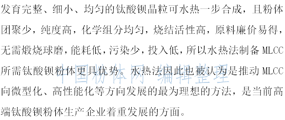 鈦酸鋇粉體是MLCC的主要原料,MLCC的發(fā)展對(duì)高質(zhì)量的鈦酸鋇粉體的要求越來(lái)越高,需求量也與日俱增。目前,制備鈦酸鋇粉體的方法有固相法、液相法、氣相法等,其中固相法和水熱法已產(chǎn)業(yè)化。固相法相對(duì)于其他方法而言,技術(shù)比較成熟,原料便宜易得,產(chǎn)量高,但此方法所需反應(yīng)溫度高,能耗較大,而且產(chǎn)品顆粒粒徑大,無(wú)法生產(chǎn)100nm以下的粉體,嚴(yán)重團(tuán)聚且組分不均勻,無(wú)法滿足MLCC的發(fā)展需求。