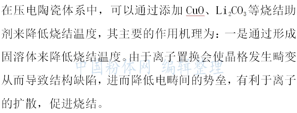 三是通過過渡液相燒結來達到降低燒結溫度的目的。低熔點添加物先形成液相促進燒結,之后被吸入到主晶相中起到摻雜改性的目的,這種“雙重效應”可以使燒結溫度降低250℃~300℃,并對性能的提高有一定的促進作用。