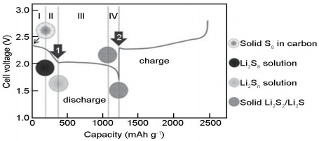 圖1 鋰硫電池第一個(gè)循環(huán)充放電示意圖