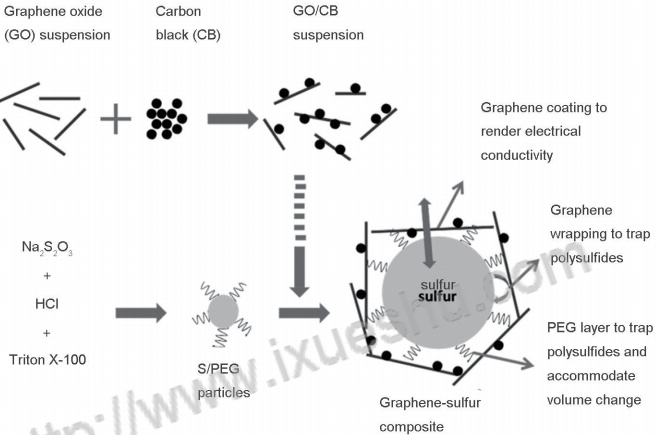 Wang等較早通過(guò)將石墨烯和硫混合直接加熱的方法將硫負(fù)載在石墨烯上,利用石墨烯的高比表面積負(fù)載硫,使電池的循環(huán)壽命顯著提高,硫的利用率達(dá)到96.36% , 循環(huán)40圈后容量仍保持600mAh/g,遠(yuǎn)遠(yuǎn)高于純硫?qū)φ諛悠返谋热萘俊kS后,Wang采用化學(xué)沉積法負(fù)載硫,如圖3,硫代硫酸鈉與鹽酸反應(yīng)生成活性物質(zhì)硫,并在石墨烯和單質(zhì)硫之間增加PEG鏈,后經(jīng)熱處理增強(qiáng)石墨烯與硫之間的連接。這種結(jié)構(gòu)不僅可以增加電極導(dǎo)電性, 還可以限制多硫化物溶解,降低穿梭效應(yīng)對(duì)電池的影響,同時(shí)硫包覆石墨烯可以有效解決充放電過(guò)程的體積效應(yīng)。該電池首次放電容量為750mAh/g, 電池循環(huán)100圈后的比容量仍在600mAh/g左右, 顯示出良好的循環(huán)穩(wěn)定性。