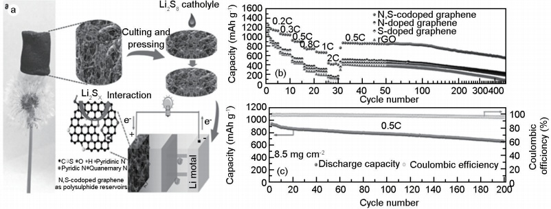 圖5 (a)氮摻雜石墨烯/硫的示意圖; (b)不同石墨烯-硫電極的電化學(xué)倍率性能;(c)0.5C倍率下的長(zhǎng)循環(huán)性能