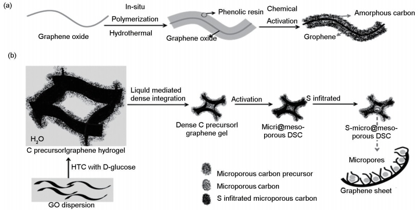 圖 6 (a)酚醛樹(shù)脂活化成非晶碳鄄石墨烯復(fù)合材料的制備示意圖 ; (b)石墨烯多孔炭復(fù)合材料制備示意圖