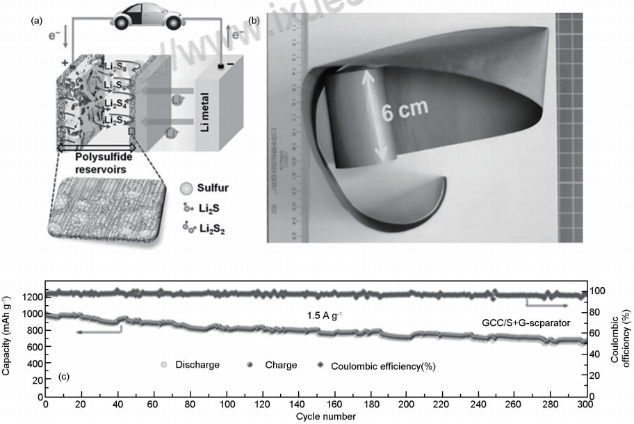 石墨烯/多孔炭材料有機(jī)復(fù)合,能兼取石墨烯和活性炭二者結(jié)構(gòu)和性能的優(yōu)勢(shì),負(fù)載和限制硫流動(dòng), 縮短電子和離子傳輸路徑,從而增加活性物質(zhì)的利用率,提高電池的循環(huán)壽命。另一方面,材料的合成成本有所提高,孔徑的控制和充分填硫仍有挑戰(zhàn)。