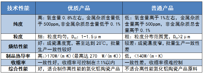 氮化鋁陶瓷產品的性能直接取決于原料粉體的特性,尤其是氮化鋁最有價值的特性——導熱性。影響氮化鋁陶瓷導熱性的因素主要有:氧及其它雜質的含量、燒結的致密度、顯微結構等。而這些因素體現在氮化鋁粉體上則為:氮化鋁的純度、顆粒的粒徑、顆粒的形狀等參數上。