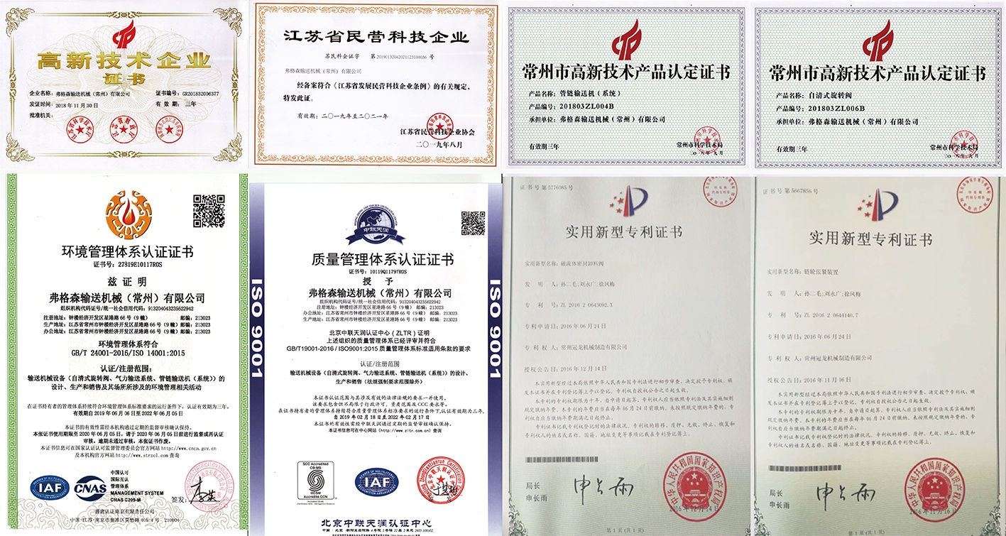 弗格森輸送機械(常州)有限公司現有總員工人數50余人,研發人員15人,其中研究生3人,本科生10人。公司自成立以來一直致力于產品的研發和技術的創新,本公司現已申請專利20項,授權專利15項,其中1項發明專利,14項實用新型專利。并于2018年被認定為江蘇省高新技術企業,同年獲得江蘇省重合同守信用企業、中國質量誠信企業的榮譽資質。2019年先后被評為江蘇省科技型中小企業,江蘇省民營科技企業, <商品售后服務評價體系>五星級企業,AAA級信用等級單位,AAA級質量服務信譽單位,AAA級重合同守信用單位,AAA級誠信經營示范單位等榮譽稱號,本公司“一種新型粉體輸送即時測重系統的研發及產業化”項目榮獲2019年常州市創新創業大賽入圍獎。