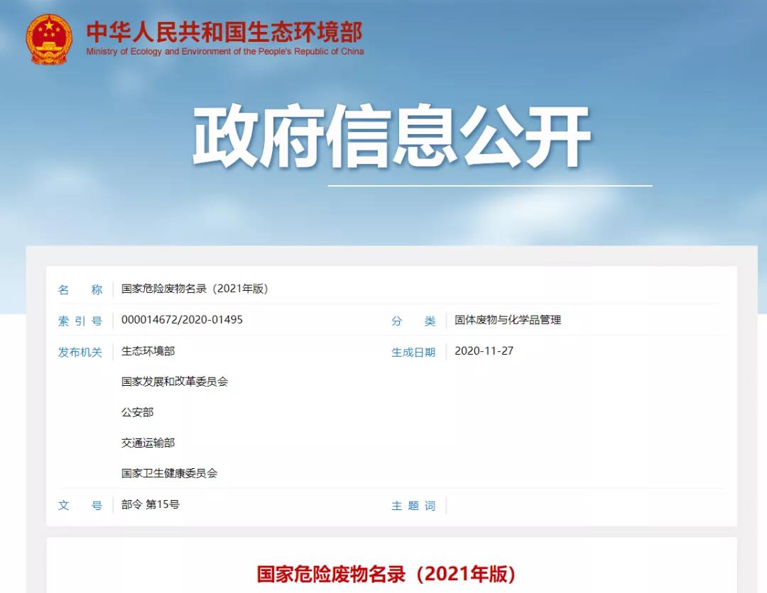 生態環境部、國家發展改革委、公安部、交通運輸部、國家衛生健康委聯合印發《國家危險廢物名錄(2021年版)》自2021年1月1日起施行!秶椅kU廢物名錄》是危險廢物環境管理的技術基礎和關鍵依據是落實新修訂的固體廢物污染環境防治法的配套規章,對加強危險廢物污染防治、保障人民群眾身體健康具有重要意義。其中,國家危險廢物名錄(2021年版)中與制藥行業有關的名錄,包括化學藥品原料藥;化學藥品制劑;生物藥品;銷售及使用過程中產生的失效、變質、不合格、淘汰、偽劣的化學藥品和生物制品,以及《醫療用毒性藥品管理辦法》中所列的毒性中藥。