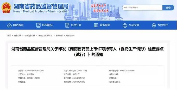 湖南省藥監局發布《湖南省藥品上市許可持有人(委托生產情形)檢查要點(試行) 》的通知,自2021年1月1日起施行,有效期2年。《檢查要點》突出持有人的管理職責,核心是持有人的機構與人員、質量管理體系、委托生產的管理、藥品上市后管理、責任賠償和各方責任義務等內容。這是2019年12月1日起實施《藥品管理法》后國內首個針對MAH (委托生產情形)檢查指南;國家層面未單獨專門制定出臺相關驗收標準,此驗收標準為國內委托他人生產制劑的MAH申辦藥品生產許可證現場檢查提供了法規層面和技術層面的參考。