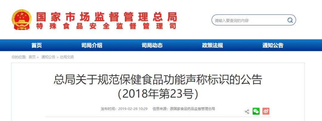 原食品藥品監管總局發布了《關于規范保健食品功能聲稱標識的公告》(2018年第23號),明確了保健食品功能聲稱標識的有關事項。未經人群食用評價的保健食品,其標簽說明書載明的保健功能聲稱前增加“本品經動物實驗評價”的字樣;此前批準上市的保健食品生產企業,應當在其重新印制標簽說明書時,按上述要求修改標簽說明書。至2020年底前,所有保健食品標簽說明書均需按此要求修改。自2021年1月1日起,未按上述要求修改標簽說明書的,按《中華人民共和國食品安全法》有關規定查處。