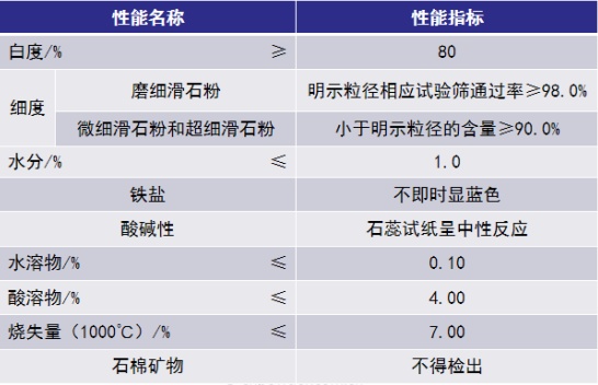 涂料-油漆用、造紙用、塑料用、橡膠用、電纜用、陶瓷用、防水材料用、通用滑石粉產品質量符合《滑石粉》(GB/T 15342)標準。