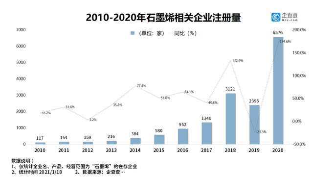 近十年我國石墨烯企業的注冊量呈增長趨勢,其中2018年和2020年是注冊量的高峰期。企查查數據顯示,2017年之前年注冊量均在1000家以內,2018年注冊量突破3000家,同比增長了132.9%。2020年更是突飛猛進,注冊量為6576家,同比增長了174.6%。
