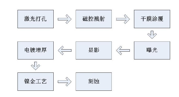 首先完成陶瓷基板的通孔制作,通常采用激光技術快速打孔,目的是實現基板垂直方向的電互連;磁控濺射一層種子層,一般采用鈦和銅作為種子層材料,鈦作為粘附層可以提高種子層與陶瓷基體的結合強度;黃光環境下,在種子層表面涂覆一層干膜,曝光、顯影獲得所需的線路,干膜工藝的優勢在于省掉了勻膠過程,簡化工藝,并且易于實現多層疊加,制作厚度達幾百微米的線路結構,即使利用單層干膜,線路厚度也可以到達50μm左右,因此線路增厚時可以獲得效果良好的垂直側壁結構。