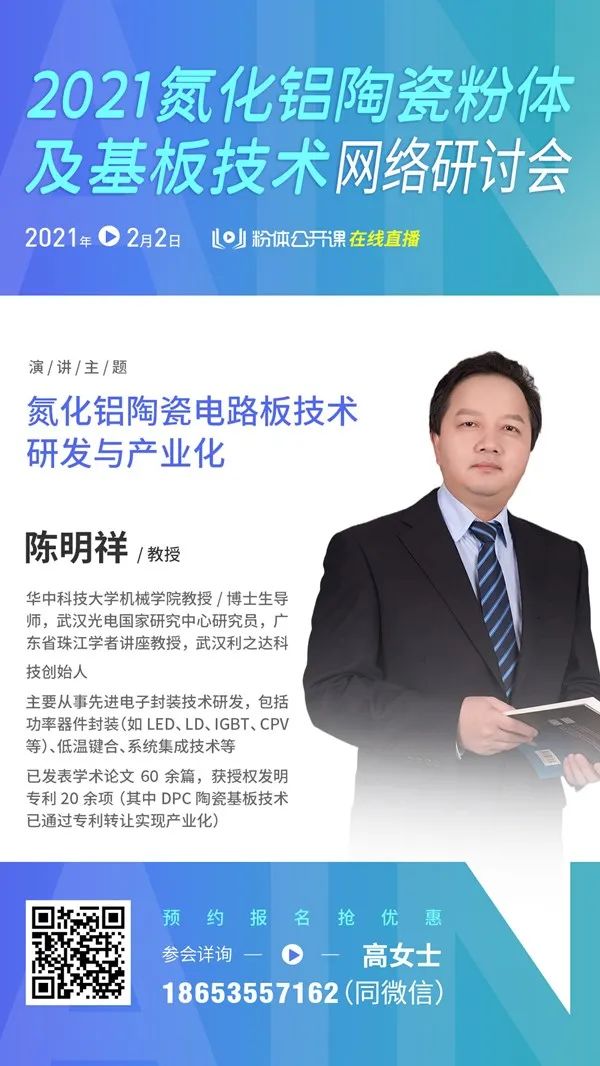 為促進氮化鋁陶瓷基板產業技術的發展,中國粉體網旗下粉體公開課平臺將于2021年2月2日舉辦首屆“2021氮化鋁陶瓷粉體及基板技術網絡研討會”。為企業管理、技術人員提供一個深度交流、深入思考、磨煉內功、強化自身的平臺。來自華中科技大學的陳明祥教授將走進粉體公開課的直播間,給大家帶來題為《氮化鋁陶瓷電路板技術研發與產業化》的報告。屆時,陳明祥教授將重點介紹氮化鋁陶瓷電路板(AlN-DPC)技術研發、產業化及其在第三代半導體、高溫電子器件、高頻晶振、小型熱電制冷器等領域的應用,并將對相關技術發展進行展望。