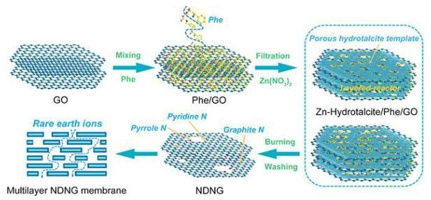 中國科學院蘭州化學物理研究所手性分離與微納分析課題組開發出一種多重限域的一步可控合成摻雜方法,制備出對稀土離子具有高分離選擇性的氮摻雜納孔石墨烯膜(專利申請號:CN 202010861481.0)。該研究在吸附了苯丙氨酸的氧化石墨烯膜的二維層間空間限域生長層狀鋅類水滑石,從而構建類水滑石/苯丙氨酸/氧化石墨烯三明治型復合材料。由于鋅類水滑石層間夾層可作為密閉反應器,通過限域燃燒,可將苯丙氨酸中的氮原子摻雜到石墨烯晶格中。同時,形成的多孔鋅類水滑石可作為模板,通過孔區域內限域燃燒在氧化石墨烯上蝕刻出孔徑可控的納米孔(圖1)。