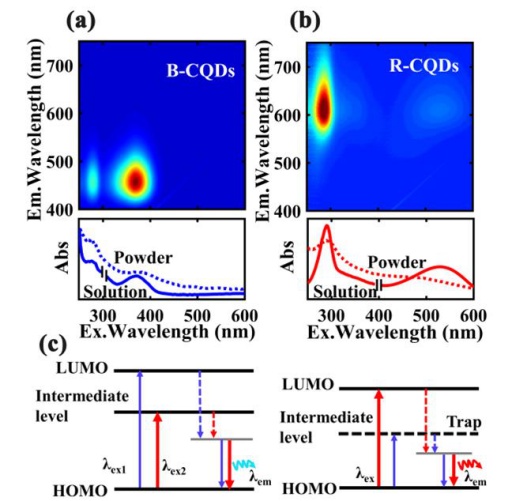 (a)兩種碳量子點的光致發光光譜;(b)兩種碳量子點的紫外-可見吸收光譜;(c)電子能級和光致發光電子躍遷示意圖