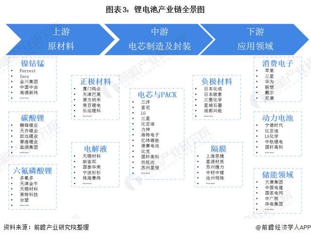 鋰電池的上游原材料主要包括鎳鈷錳、鋰礦和石墨礦,由此構成正負極材料、電解液、電極基材、隔膜等;中游則是將正負極材料、電解液、電極基材、隔膜組裝成電芯后進行制造和封裝;下游是鋰電池的應用領域。