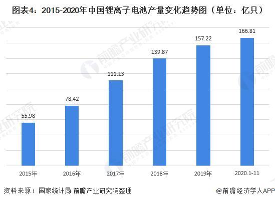 近年來3C產品對鋰電池需求量的穩定增加,以及隨著新能源汽車的市場規模逐步擴大和儲能電池的需求擴大,我國鋰電池產量規模逐年擴大。根據國家統計局數據顯示,2015-2019年我國鋰電池的產量不斷增長。2019年,我國鋰離子電池產量為157.22億只。2020年1-11月,我國鋰離子電池產量達到166.81億只。