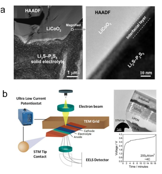 全固態電池在循環過程中,正極/電解質界面、負極/電解質界面都會發生界面反應,同時由于Li的脫嵌,正極活性物質發生體積變化,導致界面處會產生孔隙、裂紋、接觸不良等現象,增加界面阻抗,影響電池的長期循環能力。目前對于界面反應和結構變化的表征一般是直接觀測的方法或者元素分析推測。