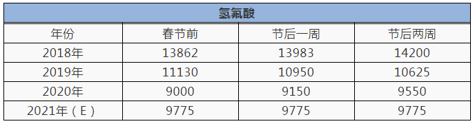 春節期間,供應方面,多數氫氟酸工廠正常生產,江西中氟等企業停車檢修,江西大唐、江西天行、順昌富寶等企業降負荷,市場整體開工水平不高,現貨供應延續偏緊;運輸方面,從2月14日開始逐步恢復正常,部分氫氟酸工廠送貨正常,庫存低位,但聽聞部分工廠運輸受限,庫存增加,有脹庫風險;下游方面,中化太倉、飛源R125催化劑再生,制冷劑行業整體開工或將下滑,需求有所減少。隆眾資訊結合近年來氫氟酸市場春節前后表現,預計氫氟酸短期上行繼續上行不易,市場延續執行合同訂單為主,重心盤整在9650-9900元/噸送到。