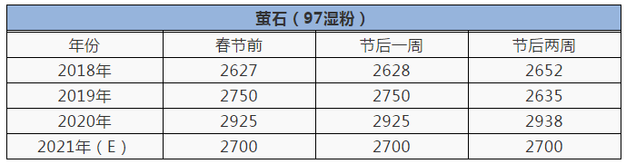 表1 近4年螢石(97濕粉)春節前后均價走勢