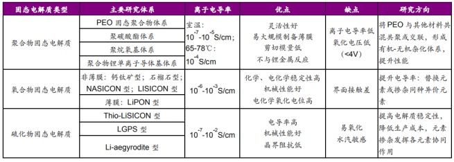 目前氧化物體系進展最快,硫化物體系緊隨其后,高能聚合物體系仍處于實驗室研究階段,硫化物和聚合物體系都已取得長足進展。