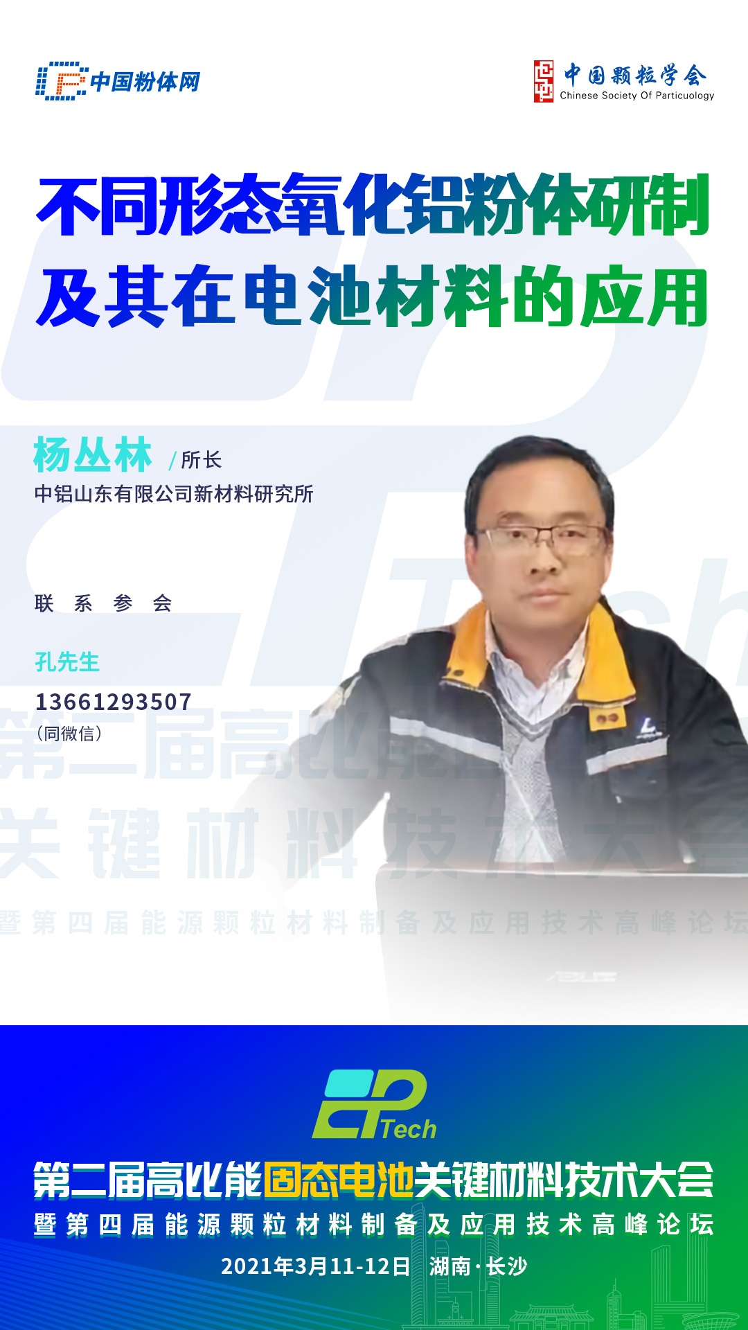 國內中鋁山東有限公司致力于尖端鋁基粉體材料的應用技術研發,解決高性能氧化鋁粉體及其延鏈產品的進口替代問題。2021年3月11-12日,由中國粉體網、中國顆粒學會能源顆粒材料專委會主辦,長沙礦冶研究院先進材料研究所協辦的“第二屆高比能固態電池關鍵材料技術大會”將在長沙吉美國際會展酒店隆重舉行,屆時,中鋁山東有限公司新材料研究所所長楊叢林將帶來報告《不同形態氧化鋁粉體研制及其在電池材料的應用》,介紹各種晶型、形貌的氧化鋁粉體的制備技術,助力固態電池的發展。