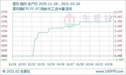 2月份螢石價(jià)格走勢(shì)小幅上漲,近期廠家反映螢石訂單情況一般,場(chǎng)內(nèi)商家出貨情況正常,場(chǎng)內(nèi)螢石貨源供應(yīng)略顯緊張,場(chǎng)內(nèi)價(jià)格走勢(shì)上漲。國(guó)內(nèi)螢石廠家運(yùn)行穩(wěn)定,場(chǎng)內(nèi)礦山和浮選裝置開工維持低位,螢石場(chǎng)內(nèi)走貨情況一般,螢石市場(chǎng)價(jià)格小幅上漲。2月份下游氫氟酸市場(chǎng)價(jià)格走勢(shì)上漲,終端下游按需采購(gòu)為主,截止月末內(nèi)蒙古地區(qū)97螢石濕粉價(jià)格在2500-2700元/噸,福建地區(qū)97螢石濕粉商談主流在2700-2900元/噸,河南地區(qū)97螢石濕粉價(jià)格在2700-2900元/噸,江西地區(qū)97螢石濕粉價(jià)格在2700-2900元/噸,近期國(guó)內(nèi)螢石價(jià)格小幅上漲。