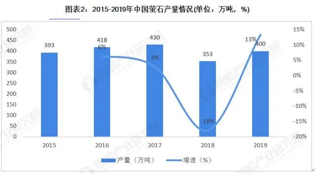 我國螢石產量較為波動,2019年螢石產量為400萬噸