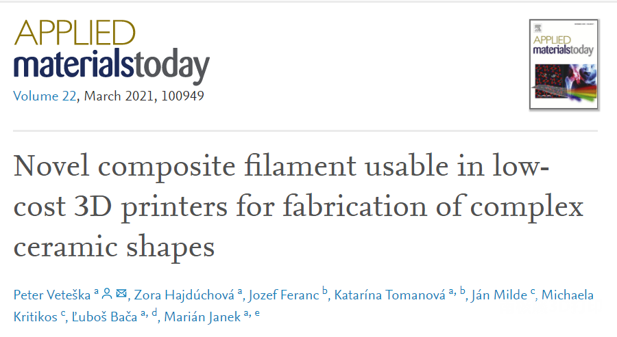 研究人員的研究結果詳見他們題為 "Novel composite filament usable in low-cost 3D printers for fabrication of complex ceramic shapes"的論文。" 該研究由Peter Veteška、Zora Hajdúchová、Jozef Feranc、Katarína Tomanová、Ján Milde、Michaela Kritikos、Ľuboš Bača和Marián Janek共同撰寫。