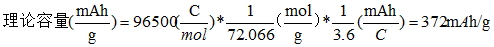 石墨負極中,鋰嵌入量最大時,形成鋰碳層間化合物,化學(xué)式LiC6,即6個碳原子結(jié)合一個Li。6個C摩爾質(zhì)量為72.066 g/mol,石墨的最大理論容量為: