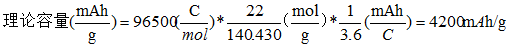 對于硅負極,由5Si+22Li++22e- ↔ Li22Si5 可知, 5個硅的摩爾質(zhì)量為140.430 g/mol,5個硅原子結(jié)合22個Li,則硅負極的理論容量為: