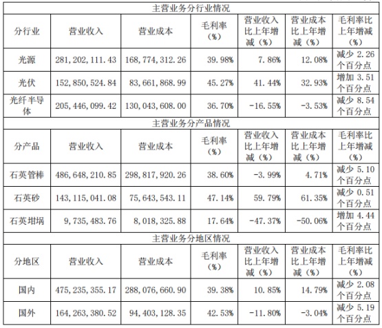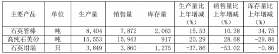 據報告,營業收入較上年同期增加2,322.86萬元,同比增長3.73%的主要原因:報告期內石英砂收入較上年同期增加5,357.04萬元,增長59.81%;石英管、石英坩堝產品收入較上年同期減少,其中石英管減少2,025.25萬元,同比下降4.00%;石英坩堝減少876.17萬元,同比下降47.37%。