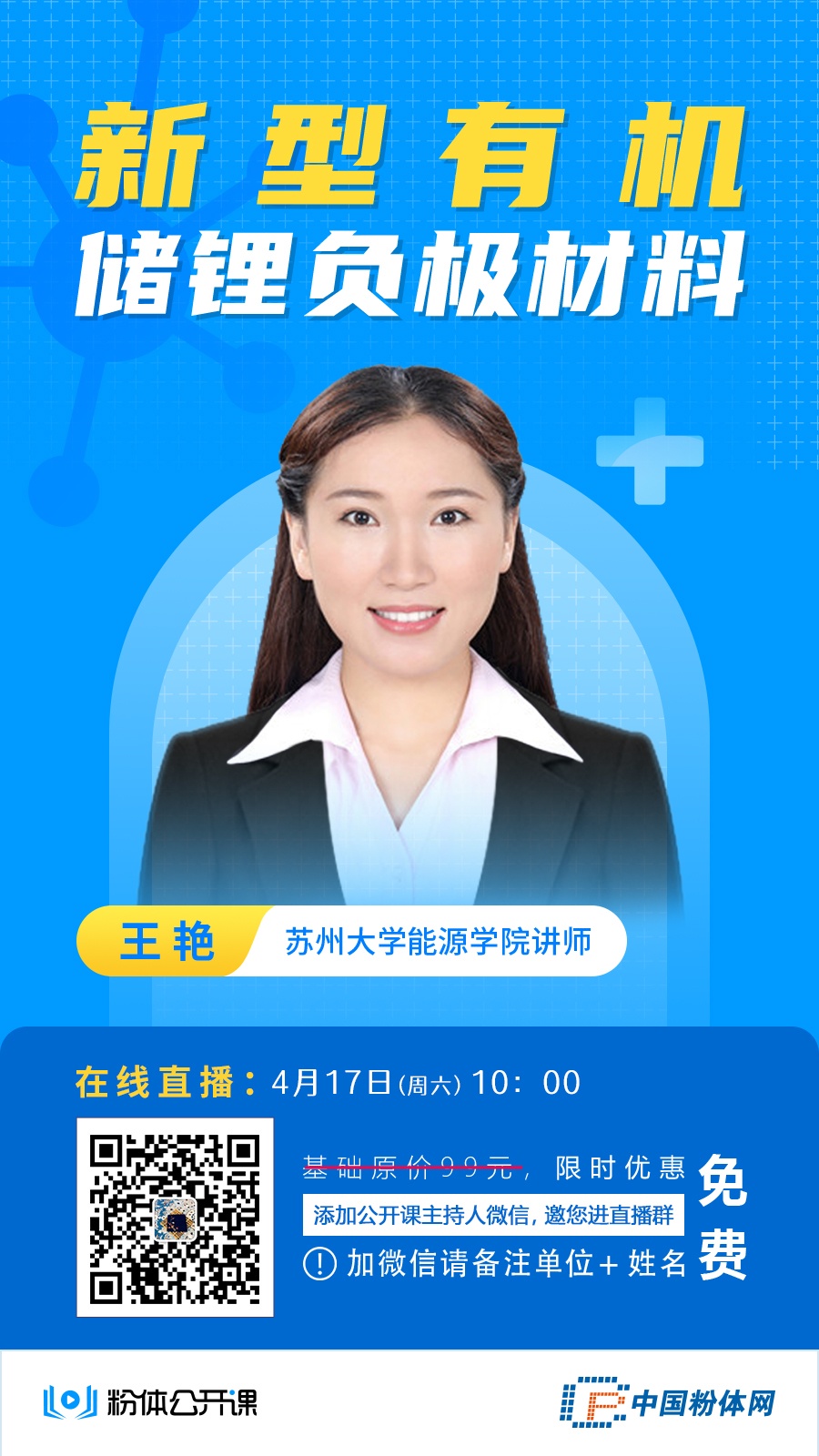 然而,有機電極仍然存在一些關(guān)鍵問題,若解決這些關(guān)鍵技術(shù)問題,將推動鋰離子電池的進一步發(fā)展。2021年4月17日上午10:00,中國粉體網(wǎng)旗下平臺粉體公開課邀請到蘇州大學能源學院講師王艷博士作《新型有機儲鋰負極材料》報告,屆時王艷博士將圍繞新型有機儲鋰負極材料這一主題,講述所在團隊研發(fā)的新型有機聚合物、絡(luò)合物、小分子酸/酸酐作為鋰離子電池負極活性材料的研究進展。