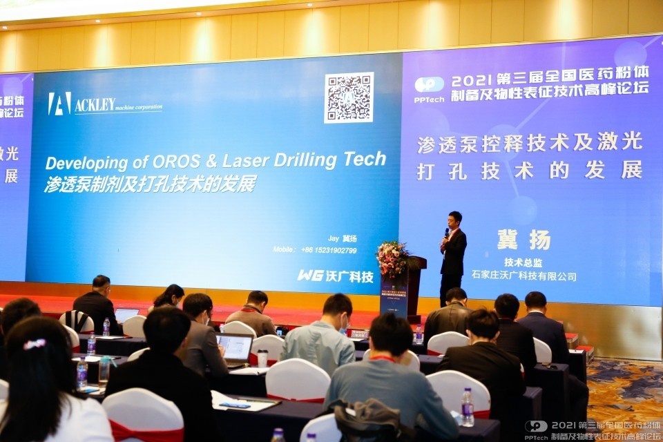 石家莊沃廣科技有限公司技術總監冀揚做《滲透泵控釋技術及激光打孔技術的發展》報告