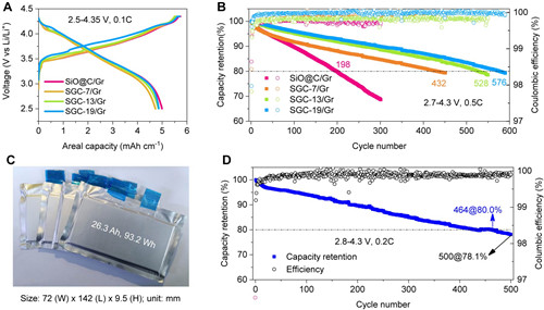 圖2(A,B)不同石墨烯改性負極與石墨復配后軟包電池首次充放電曲線(A)和循環性能(B); (C,D)353W/kg軟包電池照片(C)和長循環穩定性(D)