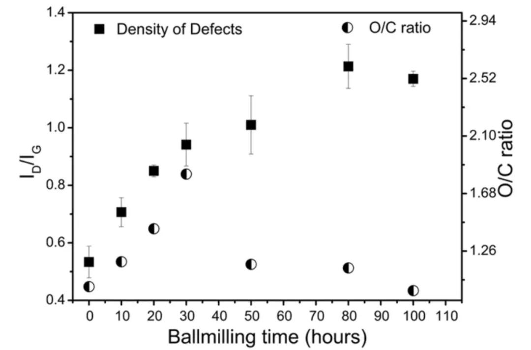 石墨烯中缺陷密度和氧化石墨烯氧化度隨球磨時間的變化