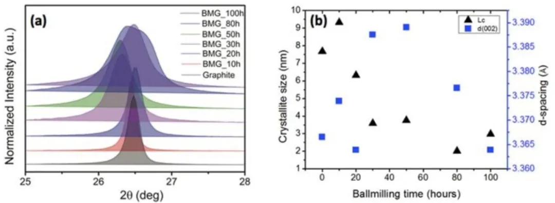 (a) 從球磨石墨中獲得的XRD曲線, (b)球磨石墨顆粒中晶粒尺寸和晶面間距的變化