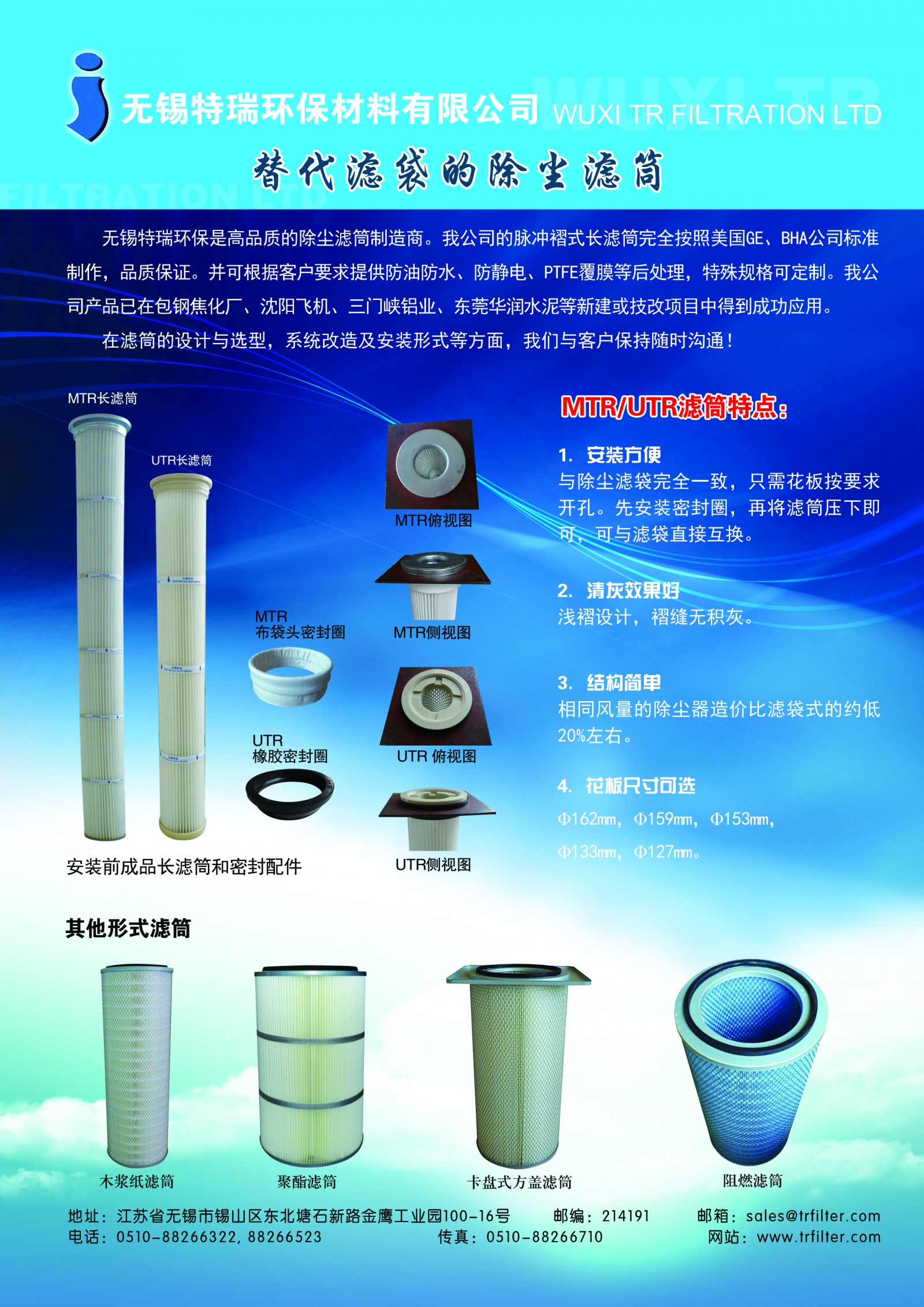 無錫特瑞環(huán)保材料有限公司是過濾行業(yè)的優(yōu)質(zhì)供應(yīng)商。濾筒除塵包括聚酯濾筒、木漿纖維濾筒、覆膜濾筒、防油防水濾筒、防靜電濾筒、脈沖褶式長濾筒等。濾袋除塵有高溫、中溫、常溫、低溫、腐蝕等各類工況產(chǎn)品及其配件,提供現(xiàn)場安裝及使用指導(dǎo)。液體01#-05#標(biāo)準(zhǔn)型的過濾,精度0.22-1000微米,過濾效率可達(dá)99.9%以上,另可根據(jù)客戶要求定制各類非標(biāo)產(chǎn)品。產(chǎn)品廣泛應(yīng)用于石油、電力、鋼鐵、汽車、造船、航空、電子、化工、水泥、煙草、橡膠、木業(yè)、陶瓷、食品、制藥、水處理等工業(yè)領(lǐng)域。