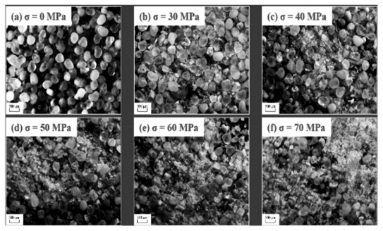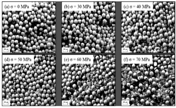 而涂利輝等在石英砂與陶粒物理特性的分析中,以工區(qū)使用的20~40目石英砂抗壓強(qiáng)度28MPa,20~40目陶粒抗壓強(qiáng)度52MPa為試驗(yàn),目的層閉合壓力在45~55MPa。通過室內(nèi)實(shí)驗(yàn)表明石英砂破碎率遠(yuǎn)大于陶粒,石英砂在閉合壓力50MPa時(shí)破碎率高達(dá)25%;而陶粒在50MPa閉合壓力下,仍然保持較完整形態(tài),破碎率<5%。