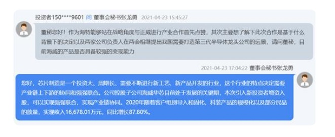 關(guān)于海威華芯引入正威金控一事,海特高新董事會(huì)秘書張龍勇表示,芯片制造是一個(gè)投資大、周期長(zhǎng)、需要不斷進(jìn)行新工藝、新產(chǎn)品開發(fā)的行業(yè),這個(gè)行業(yè)的特點(diǎn)決定需要產(chǎn)業(yè)鏈上下游的協(xié)同和強(qiáng)強(qiáng)聯(lián)合。公司控股子公司海威華芯目前處于發(fā)展的關(guān)鍵期,本次引入新投資者增資入股,可以實(shí)現(xiàn)強(qiáng)強(qiáng)聯(lián)合,實(shí)現(xiàn)產(chǎn)業(yè)鏈協(xié)同。2020年隨著客戶組別導(dǎo)入和固化、科裝產(chǎn)品的規(guī)模化以及部分民品的放量,實(shí)現(xiàn)收入16,678.01萬元,同比增長(zhǎng)87.80%。