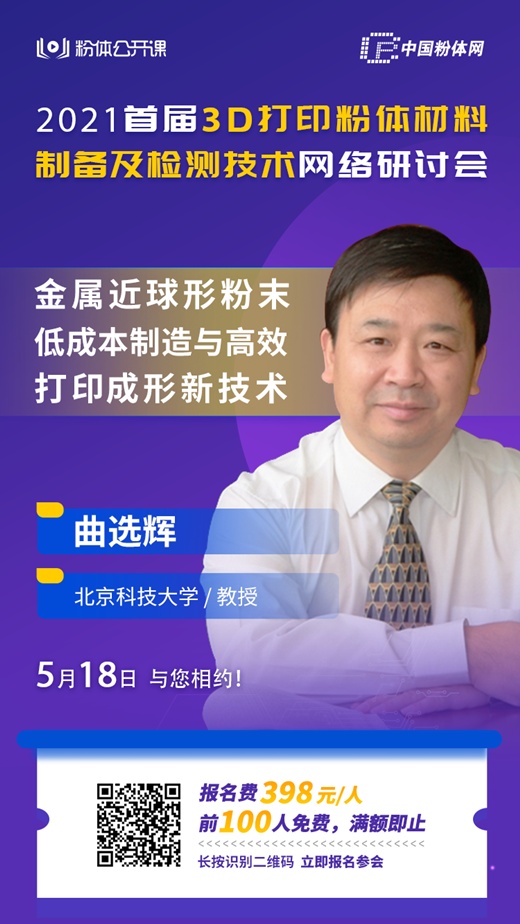 為給3D打印企業(yè)資源有效整合、實(shí)現(xiàn)“產(chǎn)學(xué)研”緊密結(jié)合提供一個(gè)良好的交流平臺(tái),中國(guó)粉體網(wǎng)旗下粉體公開(kāi)課平臺(tái)將于2021年5月18日舉辦“2021首屆3D打印粉體材料制備及檢測(cè)技術(shù)網(wǎng)絡(luò)研討會(huì)”?紤]到粉末制備及打印工藝的重要性,我們邀請(qǐng)到了北京科技大學(xué)的曲選輝教授,曲選輝教授將給大家?guī)?lái)題為《金屬近球形粉末低成本制造與高效打印成形新技術(shù)》的報(bào)告。屆時(shí),曲選輝教授將向大家介紹團(tuán)隊(duì)自主研發(fā)的近球形金屬粉末改性制備新技術(shù)及粉末喂料打印新工藝。