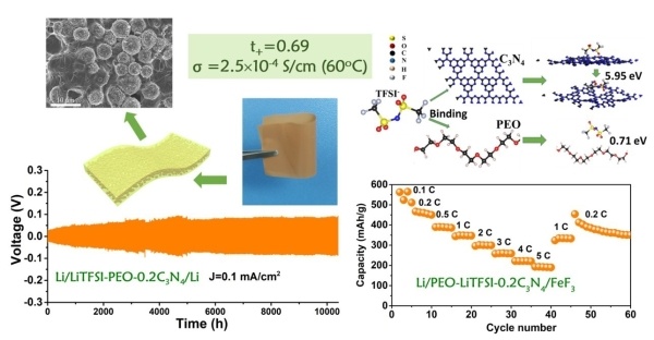 圖1.碳氮微球堆垛增強的聚合物電解質及其構造的轉換型鋰/氟化鐵全固態電池