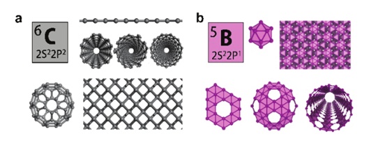 接下來研究者們便把目光瞄準了硼和氮這兩個碳元素的兩個最近鄰元素,在其單質或化合物中尋找類石墨烯的二維材料。硼在元素周期表中是碳的左“鄰居”,位于非金屬的碳和金屬的鈹之間。因此,硼呈現非金屬性的同時又兼具一定的金屬性,既可以形成常規的強共價鍵,又可形成一系列多中心化學鍵。由于成鍵能力和豐富程度勝于碳,硼具有上百種晶體結構,大部分含有12個硼原子組成的20面體的結構單元。同時,硼可與絕大部分元素形成穩定的化合物,且是設計超硬材料和金屬防腐層的重要選擇。
