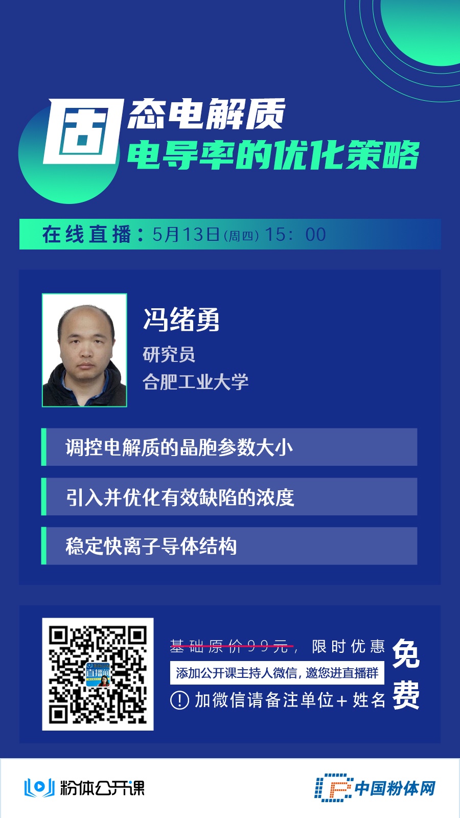 近年來,全固態鋰電池的研究主要集中在高離子電導率固態電解質的開發以及全固態鋰電池結構的優化設計。2021年5月13日下午3:00,中國粉體網旗下平臺粉體公開課邀請到合肥工業大學馮緒勇研究員作《固態電解質電導率的優化策略》報告,屆時馮研究員結合固體核磁等技術分析固態電解質的微觀結構及離子的遷移路徑,指導高電導率固態電解質的設計與制備。通過調控電解質的晶胞參數大小,引入并優化有效缺陷的濃度,穩定快離子導體結構等方法獲得導電率更高的電解質。