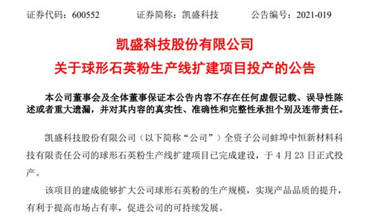 中國粉體網訊 2021年4月23日,據凱盛科技公告,全資子公司蚌埠中恒新材料科技有限責任公司的球形石英粉生產線擴建項目已經完成建設,于4月23日正式投產。據悉,該項目的建成能夠擴大公司球形石英粉的生產規模,實現產品品質的提升,有利于提高市場占有率,促進公司的可持續發展。