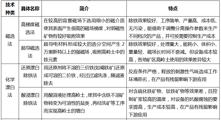 白度是高嶺土產品最重要的指標,鐵含量越高的礦產品燒成白度就越低,發展除鐵技術,提高高嶺土產品白度成為行業的必然發展趨勢。除鐵技術包括磁選法、化學漂白法、浮選法、氧化法、微生物法等多種技術。其中,磁選法是除鐵技術最主要發展方向,鐵元素在高嶺土中主要有多種形式存在,各個礦區高嶺土原礦中鐵元素的存在形式差異較大,在實際除鐵過程中,需要針對不同情況制定具有針對性除鐵方案,才能提高除鐵效果。磁選除鐵已經發展出高梯度磁選、超導磁選等技術。