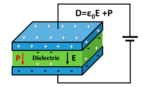 最簡單的介電電容器由被絕緣體隔開的兩個平行金屬板組成,該絕緣體在施加電場時會極化。這是介電材料的定義行為。理想電容器的實際電容C(即存儲電荷的能力)由存儲在每個金屬板上的電荷Q與施加的電壓V之比得出,如以下公式所示: